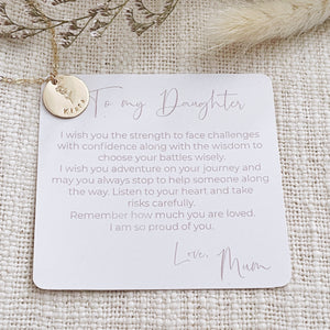 A sweet necklace for a daughter for her 18th or 21st birthday. This birth flower and name disc necklace comes lovingly packaged with a meaningful Daughter card as shown.